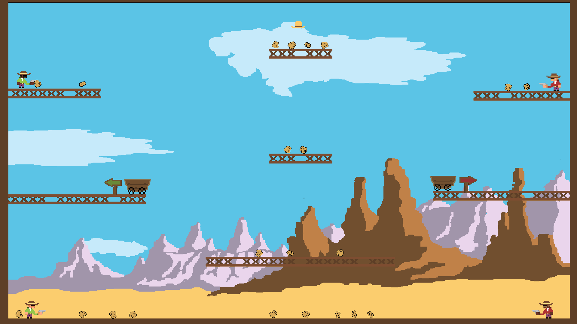 Buckle up, pardners, and get ready to shoot, steal, and swing in this wild 2v2 game! Collect coins, hold onto the golden cowboy hat, lasso around the playing field, and shoot 'em up to be crowned top gun 'round these parts of the Wild West.